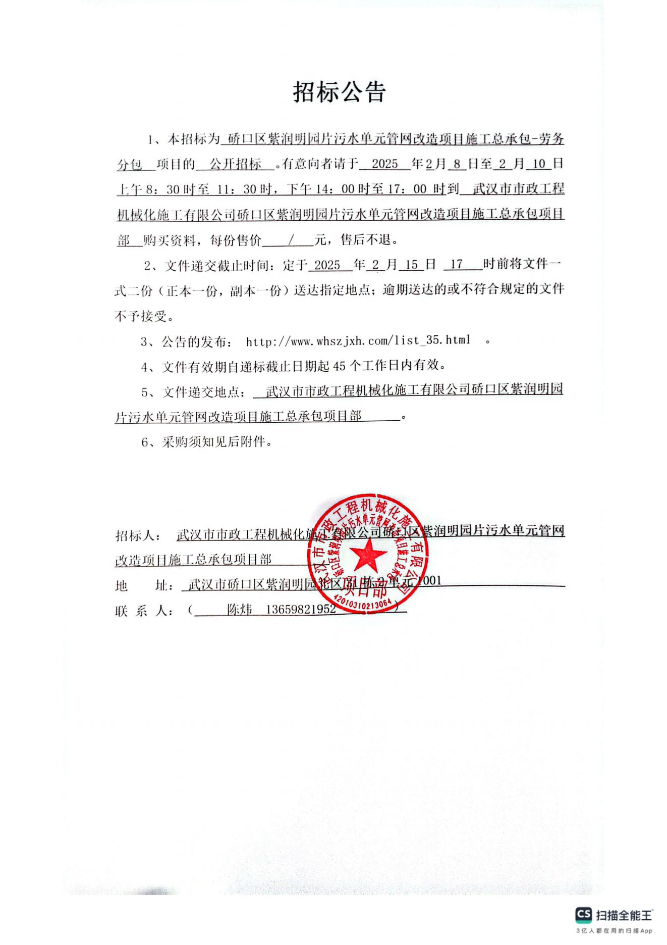 硚口區(qū)紫潤(rùn)明園片污水單元管網(wǎng)改造項(xiàng)目施工總承包-勞務(wù)分包招標(biāo)公告