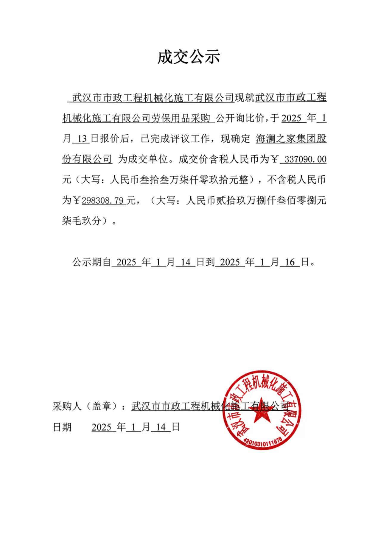 武漢市市政工程機械化施工有限公司勞保用品采購成交公示