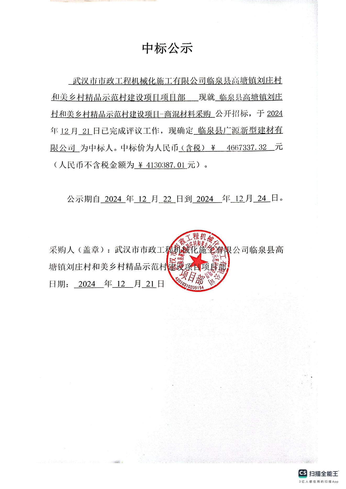 臨泉縣高塘鎮(zhèn)劉莊村和美鄉(xiāng)村精品示范村建設項目-商混材料采購中標公示