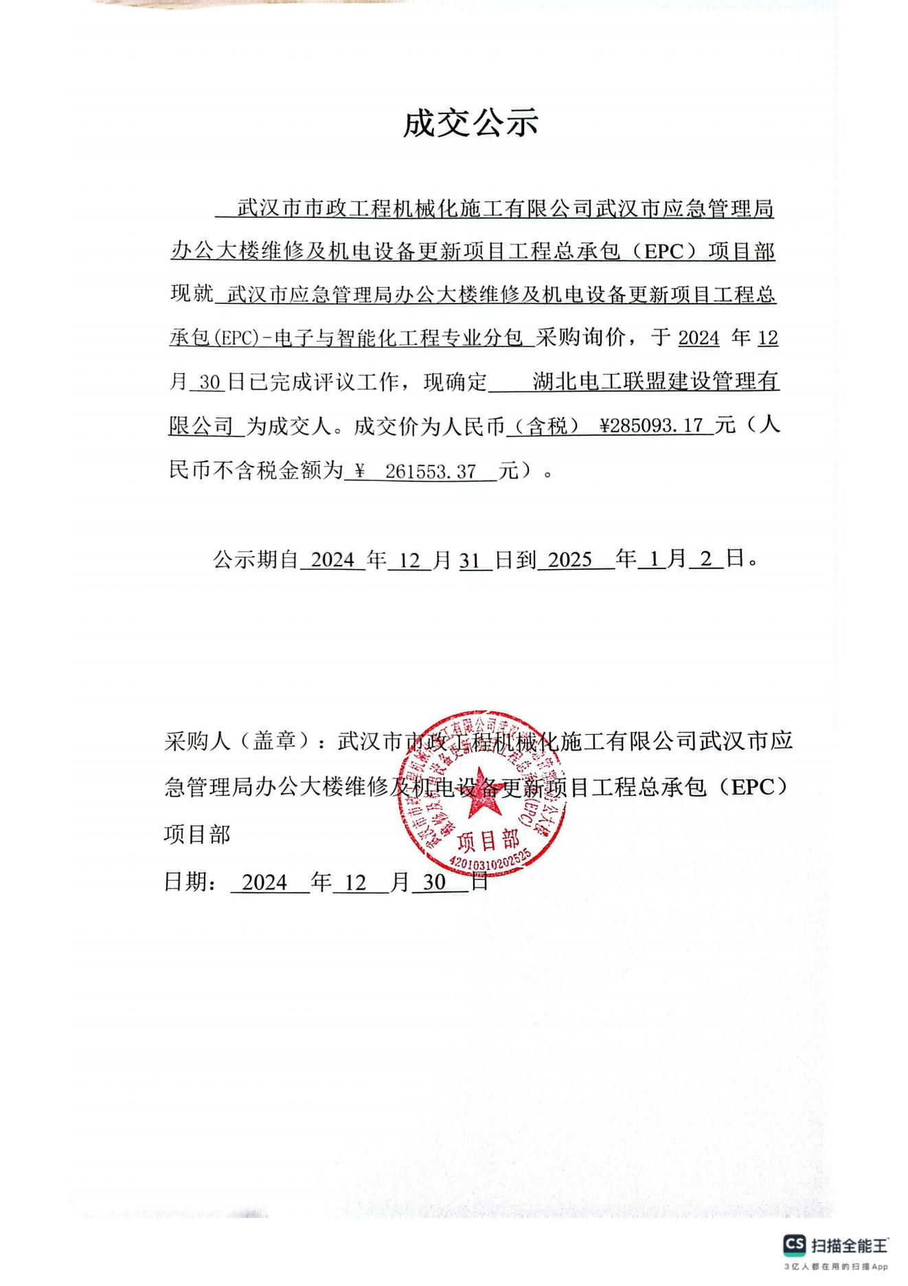 武漢市應急管理局辦公大樓維修及機電設備更新項目工程總承包(EPC)-電子與智能化工程專業(yè)分包成交公示