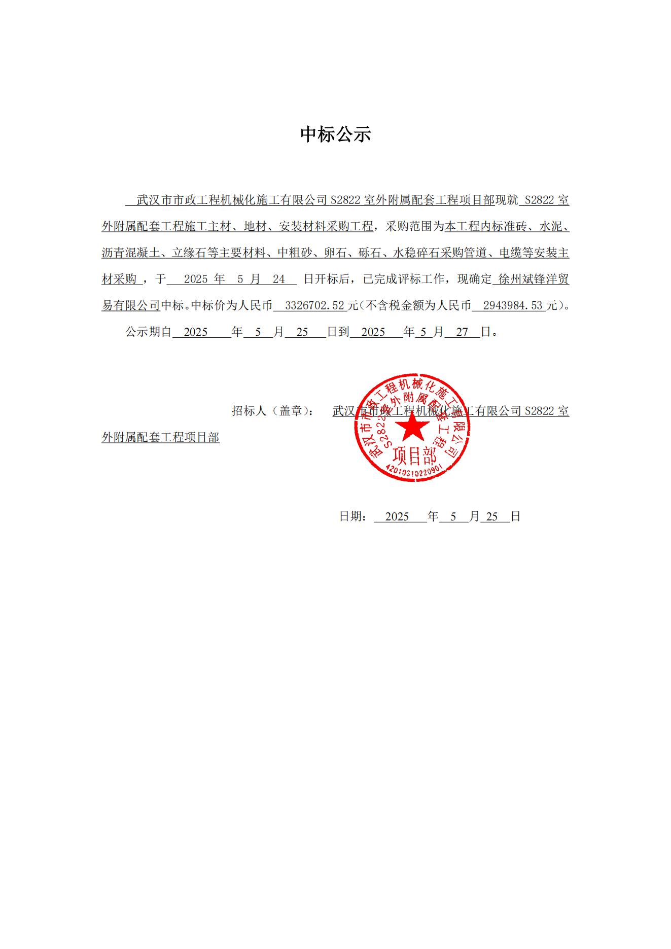 S2822室外附屬配套工程施工主材、地材、安裝材料采購(gòu)工程中標(biāo)公示