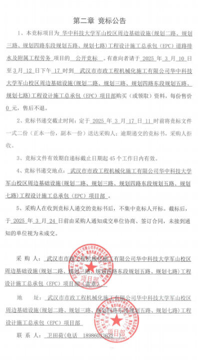 華中科技大學(xué)軍山校區(qū)周邊基礎(chǔ)設(shè)施(規(guī)劃二路、規(guī)劃三路、規(guī)劃四路東段規(guī)劃五路、規(guī)劃七路)工程設(shè)計(jì)施工總承包(EPC)道路排水及附屬工程勞務(wù)競(jìng)標(biāo)公告